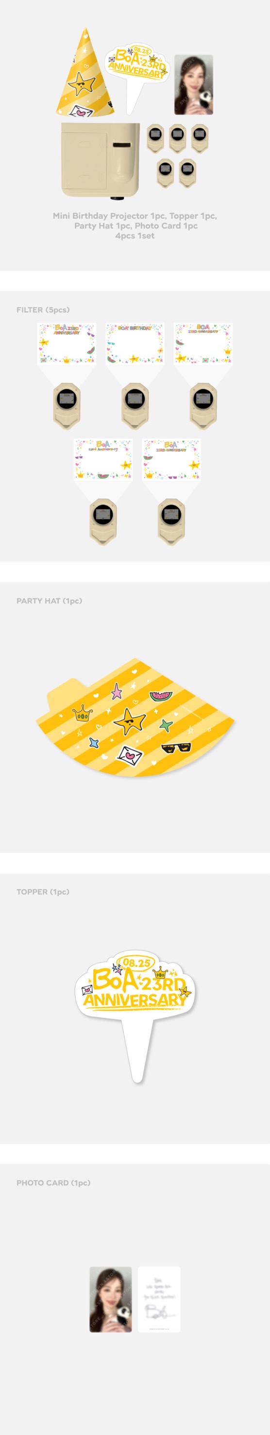 迷你生日投影儀1pc、topper1pc、尖頂帽1pc、寫真小卡 1pc